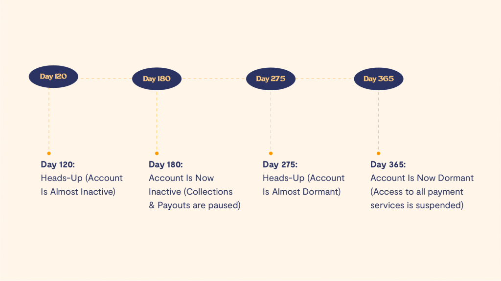 • At 120 Days of No Transactions: You’ll get a friendly heads-up. We will send you an email and a notification on your dashboard just to let you know your account is approaching inactivity.